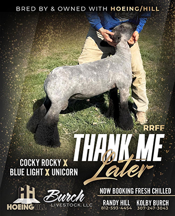After seeing the quality and consistency of the Joint Custody lambs this spring, we were convinced that the outcross pedigree of Johnson and Garret breeding would be a tremendous addition to our flock. Grounds For Divorce combines a cool look with an explosive rack and big leg. Thanks to Mike Karr and Troy Shilder for giving us the opportunity to add him to our sire line up.